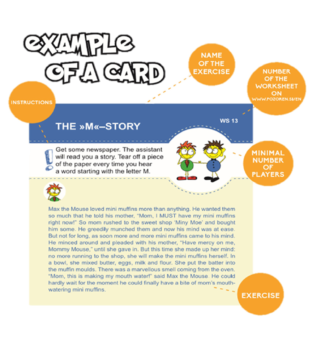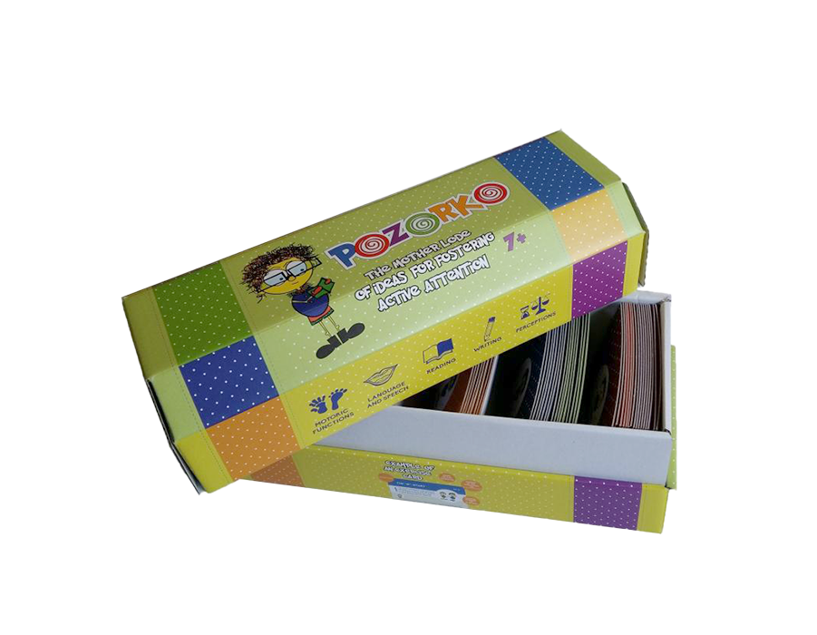 - 100 kartončkov z vajami (50 kartončkov z vajami za spodbujanje vidne pozornosti in 50 kartončkov z vajami za spodbujanje slušne pozornosti)