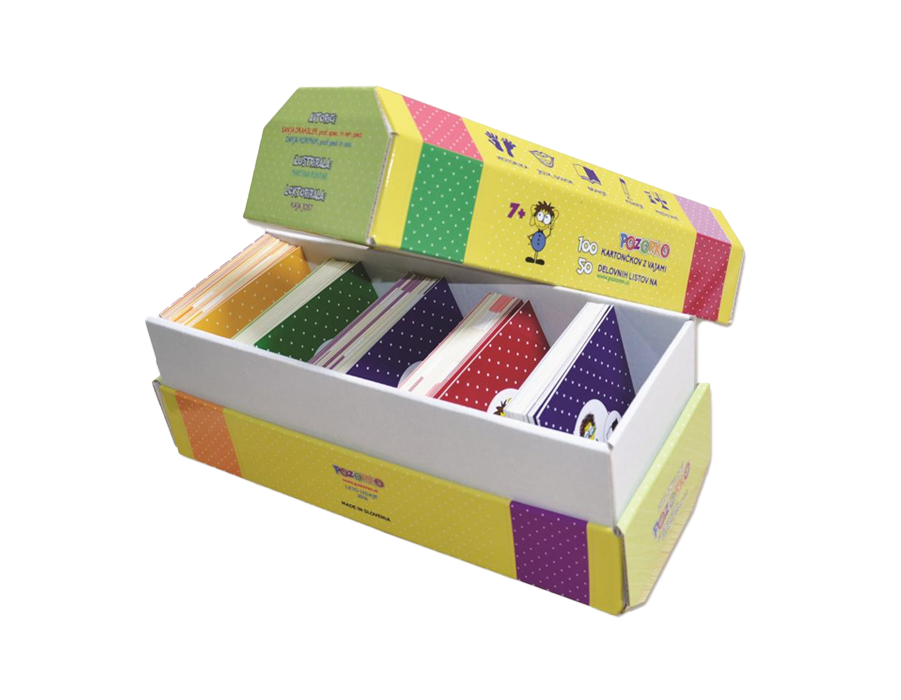 - 100 kartončkov z vajami (50 kartončkov z vajami za spodbujanje vidne pozornosti in 50 kartončkov z vajami za spodbujanje slušne pozornosti)